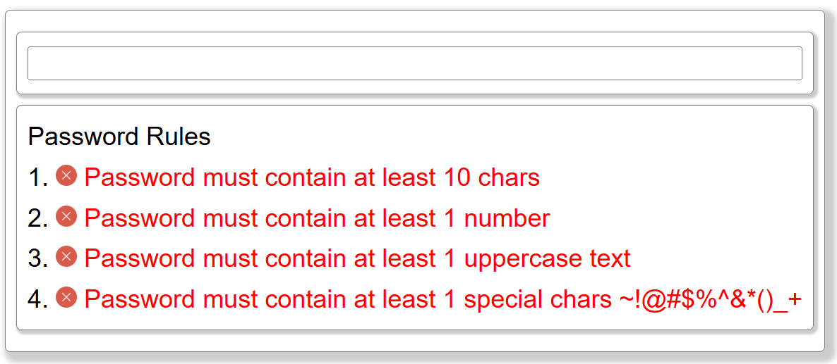 errorText: "Password must contain at least 1 special chars ~!@#$%^&*()_+",